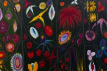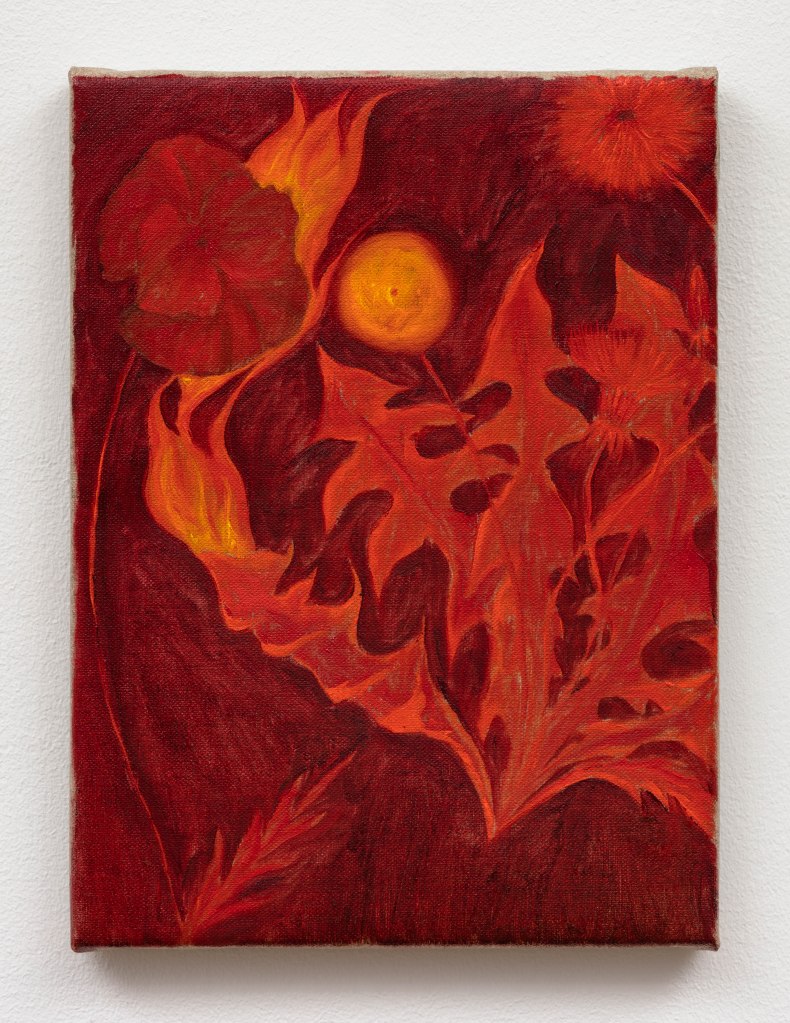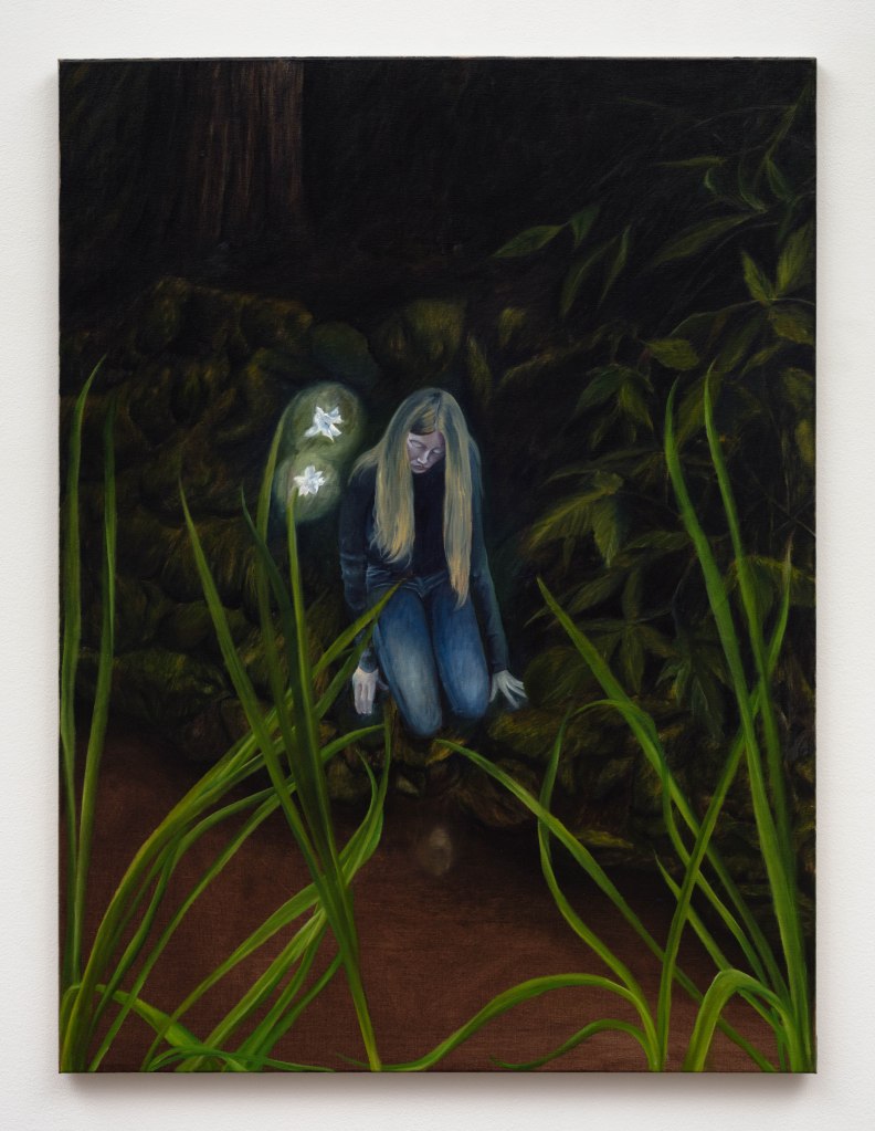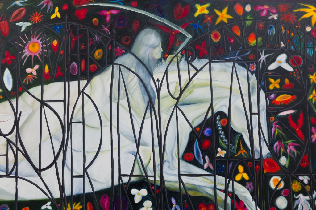 Like a vision of art history projected through a prism, Chowdhury’s work refracts received conventions of the “painting” and the “artist,” mixing fiction and autobiography, and past and present. The mural-sized Pale Rider reinterprets the Biblical story of the Horsemen of the Apocalypse, presenting a ghostly woman and her steed galloping through a floral landscape, past a framework of letters that form William Blake’s poem A Divine Image. Narcissus pictures a contemplative woman in jeans, rather than the obsessive male youth of the Greek myth, peering into a dark pool that holds only the faintest hint of her reflection. Father and Son places parent and child outside, at night, bathed in an uncanny green moonlight. Flowers on Fire saturates a variety of flowers in the red-hot glow of a multiplicity of small fires, while An Old Dream pictures wilting flowers in a faint but sensual light next to a pair of scissors.