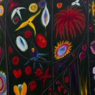 Like a vision of art history projected through a prism, Chowdhury’s work refracts received conventions of the “painting” and the “artist,” mixing fiction and autobiography, and past and present. The mural-sized Pale Rider reinterprets the Biblical story of the Horsemen of the Apocalypse, presenting a ghostly woman and her steed galloping through a floral landscape, past a framework of letters that form William Blake’s poem A Divine Image. Narcissus pictures a contemplative woman in jeans, rather than the obsessive male youth of the Greek myth, peering into a dark pool that holds only the faintest hint of her reflection. Father and Son places parent and child outside, at night, bathed in an uncanny green moonlight. Flowers on Fire saturates a variety of flowers in the red-hot glow of a multiplicity of small fires, while An Old Dream pictures wilting flowers in a faint but sensual light next to a pair of scissors.