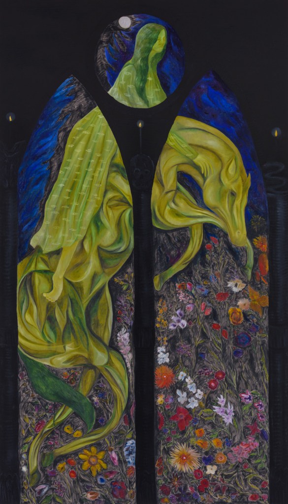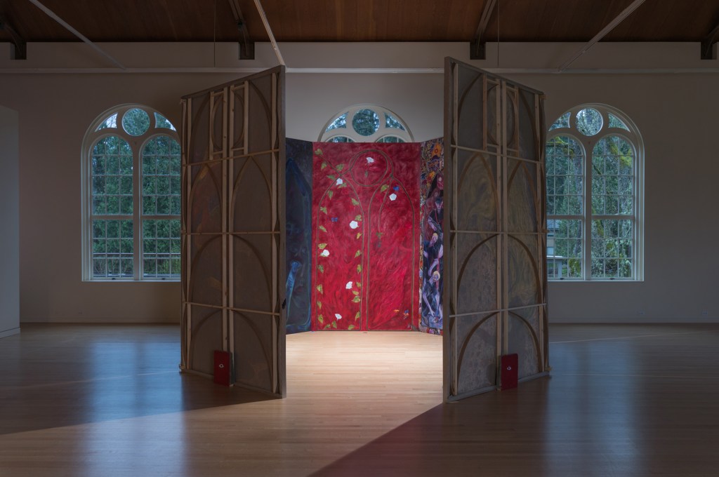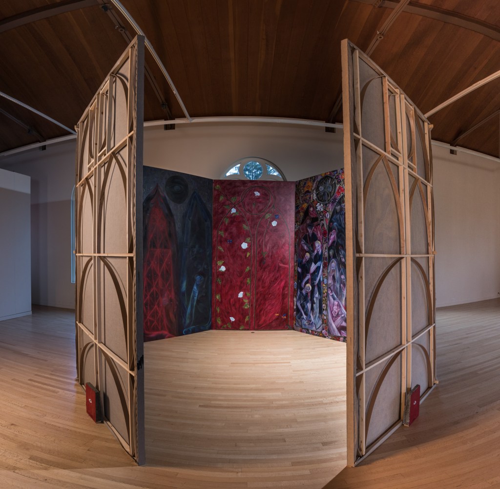 Revelation Theater uses the architecture of The Art Gym (located in Oregon’s oldest catholic university, Marylhurst) and imagery from the Book of Revelation as a jumping off point to think about the consequences of a worldview that anticipates the end.
